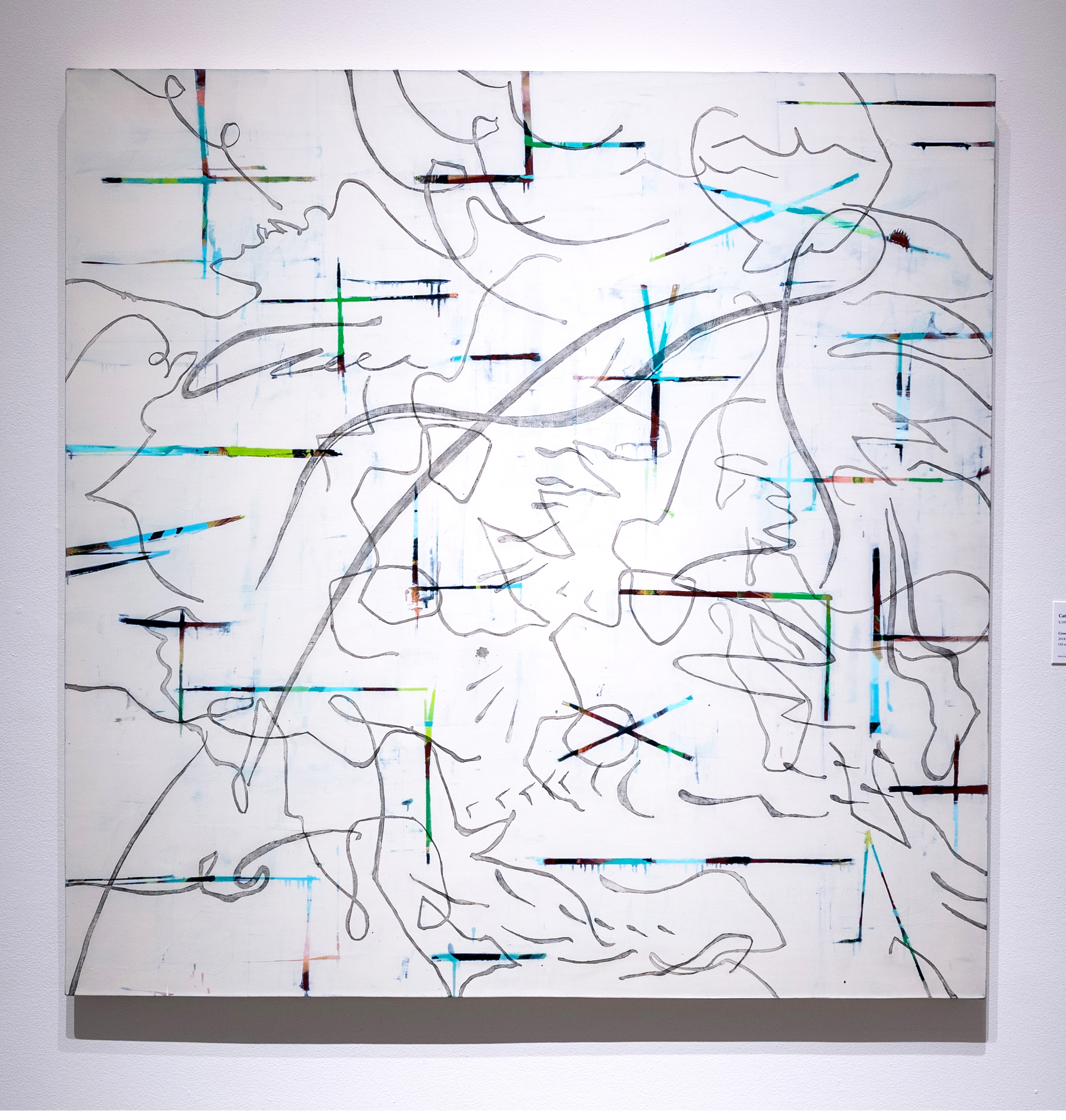 Crossbeat, 2018, oil on canvas, 60 x 60 inches. This painting is from my Avian Witness series. It contemplates primordial forces—bird migration, magnetic fields, wind—and their juxtaposition with human activity. Source materials, some embedded beneath layers, include aerial landscape views, topographic maps, gestures of penmanship, and my pen-and-ink drawings of the movement of birds.