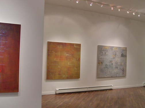 Based on my exploration of 19th-century vernacular penmanship, these works contain vestiges of elementary mark-making. Alphabets, signatures, equations, doodles serve as counterpoints to my looser treatment of line, edge and space. The text is merged into the overall atmosphere of the paint, resulting in works evoking both landscape and pages of books. While we think of doodles as free from any rules, one can see an indelible residue of proper penmanship. The tension between forced conformity and unfettered meandering plays itself out in these paintings.